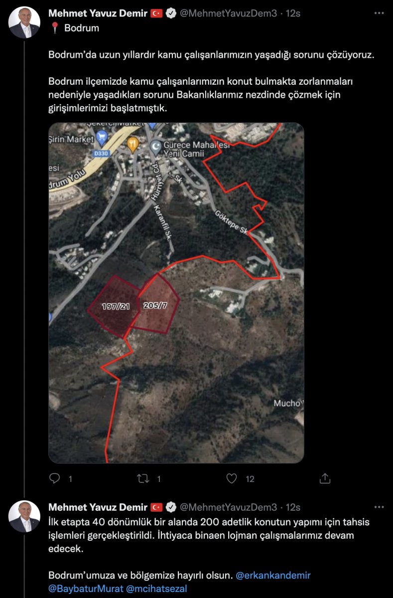 Demir, sosyal medya hesabından yaptığı paylaşımda, Gürece Mahallesi'ndeki konumun bilgisini vererek, ilçede uzun yıllardır kamu çalışanlarının yaşadığı sorunu çözeceklerini belirtti.