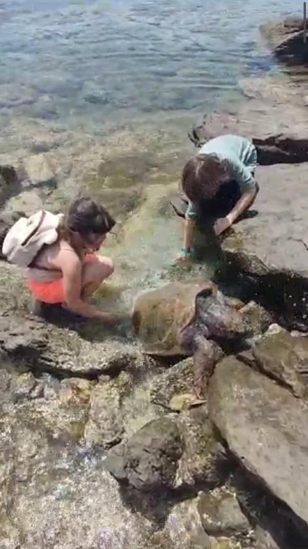 Bodrum Aşağı Mazı Mahallesi sahilinde kıyıya vurmuş 'caretta caretta' cinsi deniz kaplumbağası olduğunu fark edenler, durumu Muğla 911 Arama Kurtarma ve Araştırma Derneği'ne bildirdi. Bölgeye ulaşan ekipler, kaplumbağanın nefes almakta zorluk çektiğini belirleyip, Deniz Kaplumbağaları Araştırma, Kurtarma ve Rehabilitasyon Merkezi (DEKAMER) ile iletişime geçti. Bölgeye gelen DEKAMER yetkilileri, caretta carettayı, alarak tedavi için merkeze götürdü. Öte yandan, kıyıya vuran deniz kaplumbağasına 2 çocuğun, hayatta kalması için elleriyle deniz suyunu atmaları dikkati çekti. (DHA)