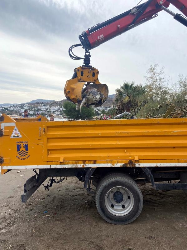 Türkbükü sahilinde, bu sabah yürüyüş yapan vatandaşlar, hareketsiz şekilde duran caretta caretta cinsi deniz kaplumbağası olduğunu fark edip, durumu belediyeye bildirdi. Belediye ekiplerinin yaptığı kontrolde deniz kaplumbağasının öldüğü belirlendi. Vücudunda herhangi darp ve yara izi bulunmayan deniz kaplumbağası vinç yardımıyla bölgeden alındı. Deniz kaplumbağasının ölüm nedeninin belirlenmesi için Ortaca ilçesindeki Deniz Kaplumbağaları Araştırma, Kurtarma ve Rehabilitasyon Merkezi (DEMAMER) gönderileceği bildirildi.(DHA)