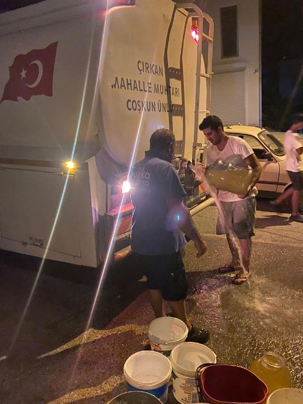 Bodrum'un Çırkan Mahallesi'nde yaklaşık 3 gündür suların kesik olması mahalle halkına zor anlar yaşattı. Vatandaşların mağduriyetini gidermek isteyen Coşkun Ünal, yangınla mücadele için mahalleye alınan tankerle cadde ve sokaklarda su dağıttı. Vatandaşlar ellerinde damaca ve kovalarla tankerin önünde kuyruk oluşturdu. Muhtar Ünal, sıcak havaya rağmen mahallelerinde yaşanan su kesintisinin vatandaşları zor durumda bıraktığını, ihtiyaçlarının bir bölümünü karşılamak için tankerle su dağıttığını söyledi.