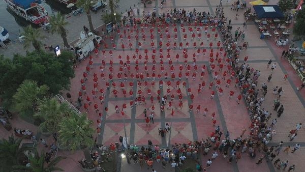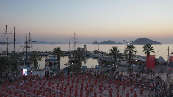 MUĞLA'nın Bodrum ilçesinde, 30 Ağustos Zafer Bayramı etkinlikleri kapsamında 300'den fazla kişi harmandalı ve zeybek oynadı. O anlar dronla havadan görüntülendi.