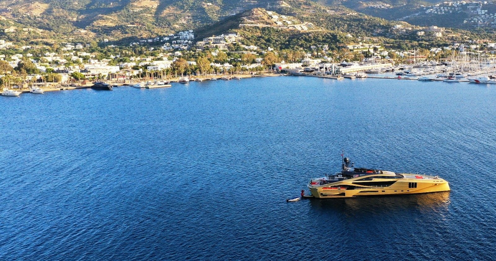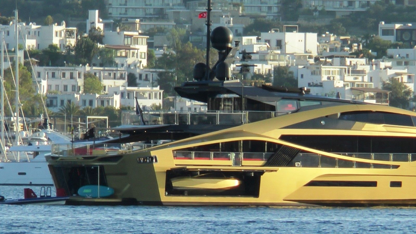 Milyon dolarlık yatlar Muğla'nın Bodrum ilçesine gelmeye başladı. 28 milyon 500 bin euroluk altın renkli mega yat "Khallılah" görenleri kendine hayran bıraktı.