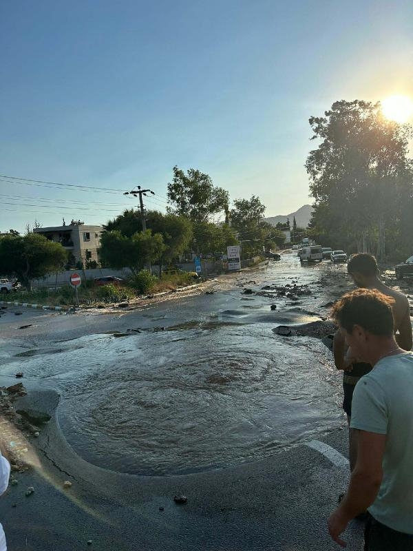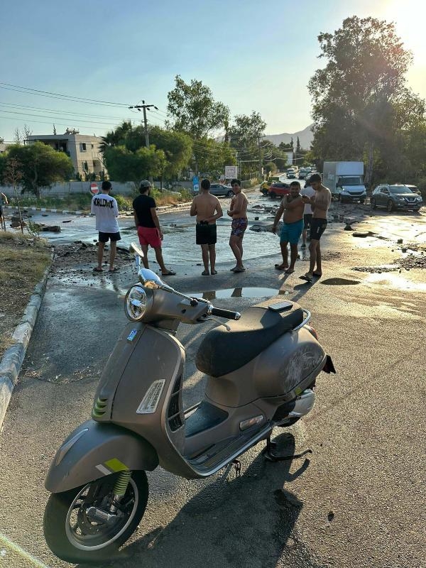 Olay, dün saat 19.00 sıralarında Ortakent Ali Kelle Ormanı önünde meydana geldi. Bitez-Ortakent yolunda ana su isale hattında patlama oldu. Suyun yükselmesiyle 48 VS 181 plakalı motosikletiyle yoldan geçen Serkan Özbey ve köpeği havaya fırladı. Özbey ve köpek yaralanırken, ihbarla bölgeye sağlık ekibi, veteriner hekim sevk edildi. Sağlık ekipleri tarafından yaralı Serkan Özbey hastaneye, köpek ise veteriner tarafından belediyeye götürüldü. Patlama sırasında akan su ile asfaltta çökme oluştu, yol kullanılamaz hale geldi.