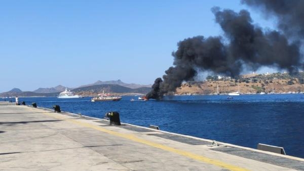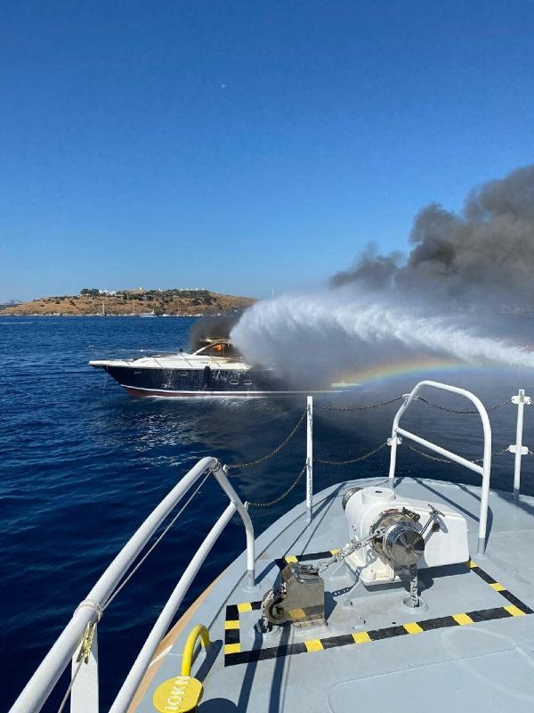 MUĞLA'nın Bodrum ilçesi açıklarında, 10 metrelik motoryatta yangın çıktı. Alevler, 1 saatte söndürülürken motoryatın, bağlandığı tekneyle götürüldüğü anlar ise kameraya yansıdı.