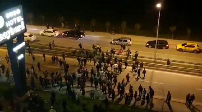 TFF 2'nci Lig Play-Off yarı final rövanşı için Bayburt'a giden Bodrumspor kafilesinin kaldığı oteli basmaya gelen taraftar, küfürlü tezahüratlar yaparken otel önünde çok sayıda torpil patlattı.
