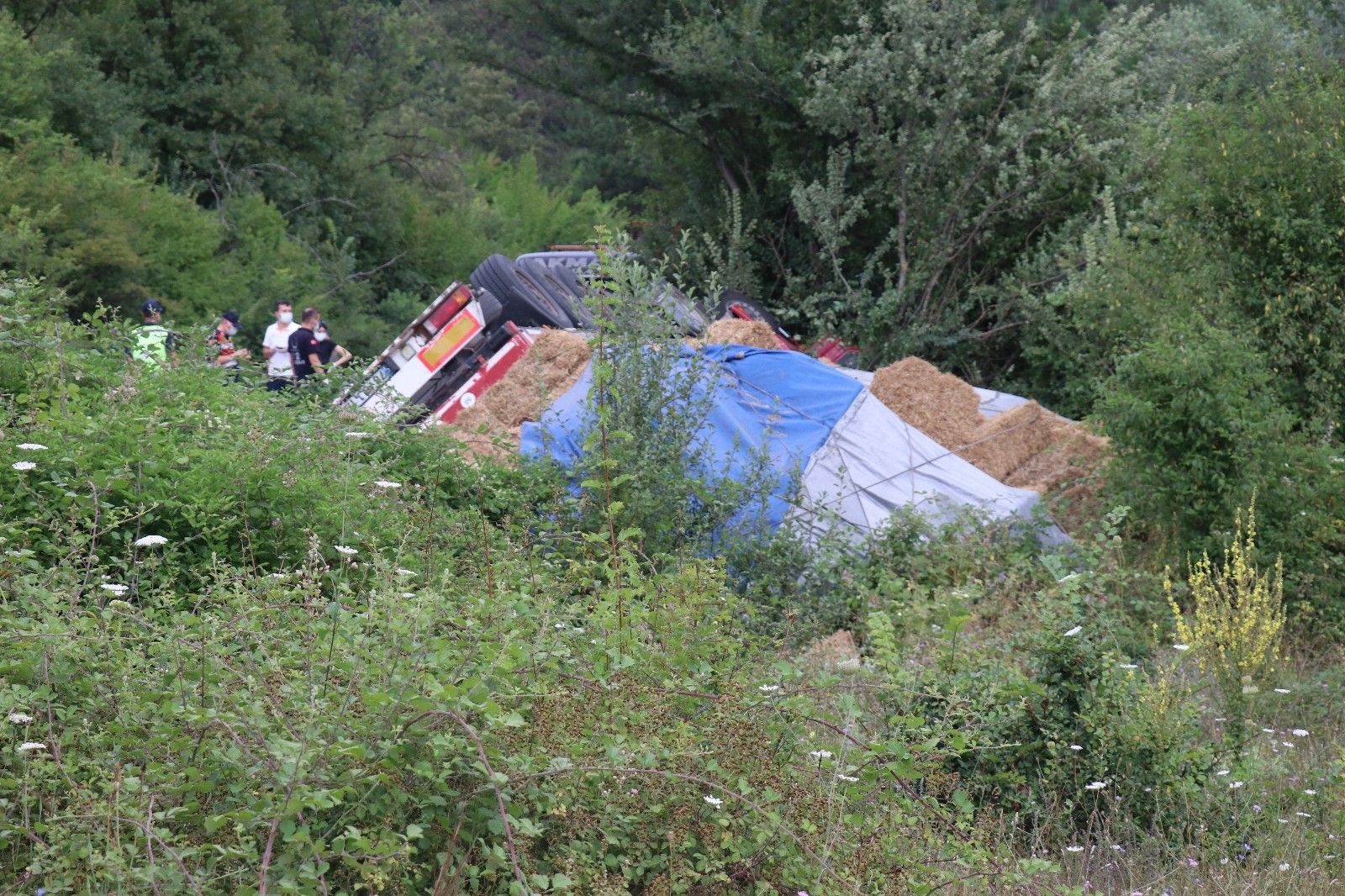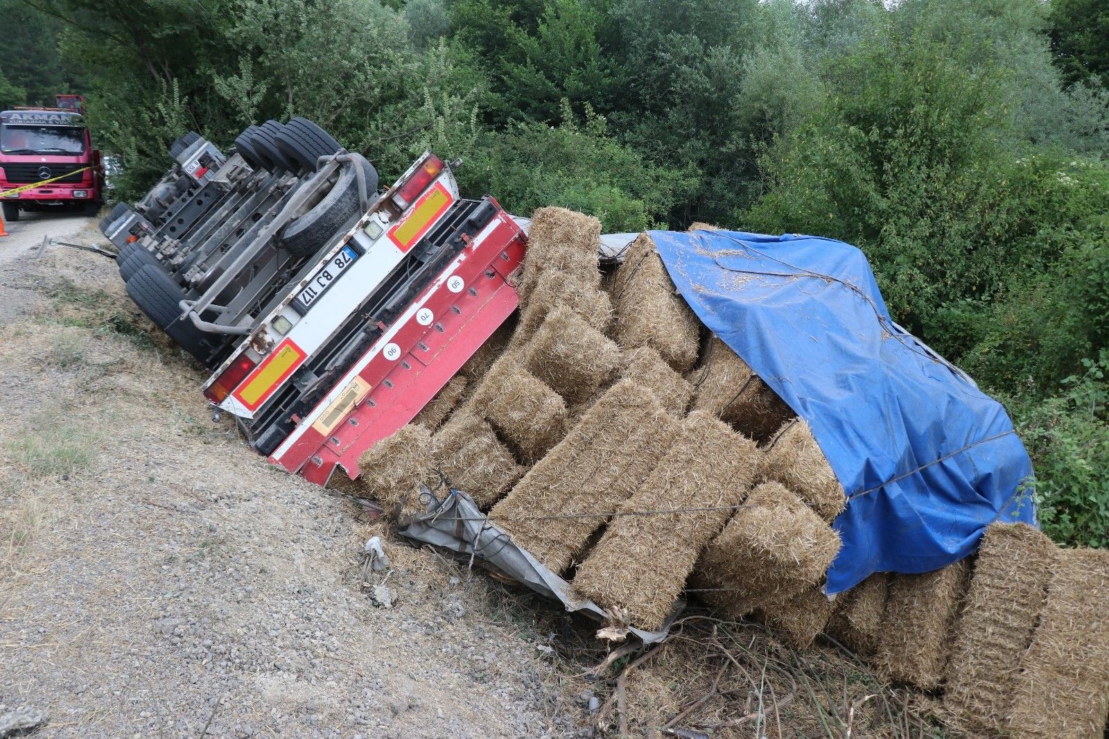 Bolu'nun Mengen ilçesinde seyir halindeyken şarampole devrilen saman balyası yüklü tırın sürücüsü Coşkun Topraklı (46) olay yerinde hayatını kaybetti.