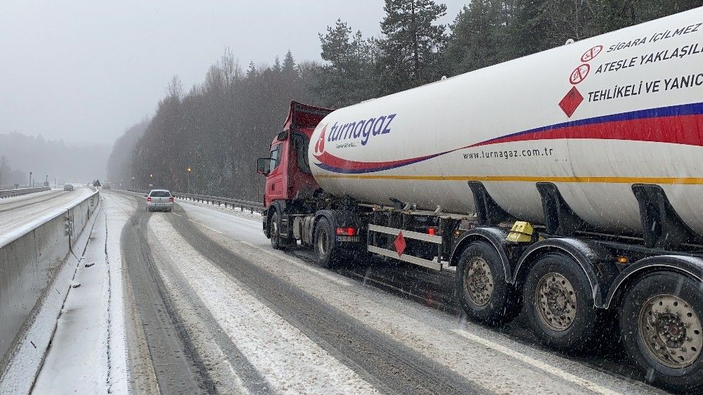 Türkiye'nin en önemli geçiş güzergahlarından Bolu Dağı'nda sabah saatlerinde kar yağışı etkili oldu. Yoğun kar yağışı sebebiyle bazı araçlar yolda kaldı. Dağı tırmanamayan bir tır sürücüsü zor anlar yaşadı. Tır sürücüsünün yardımına trafik polisleri koştu.