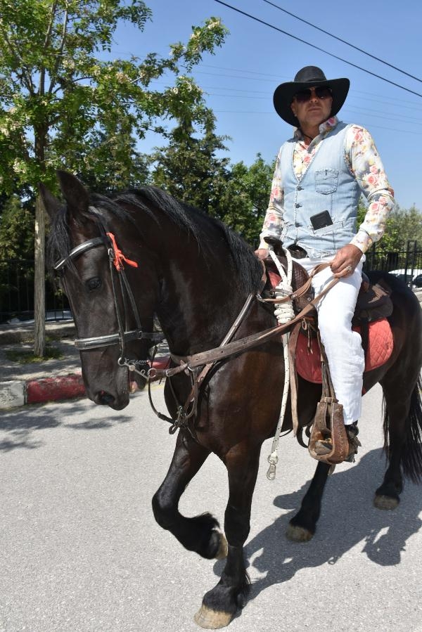 İZMİR'in Bornova ilçesinde at eğitmeni Faruk Ceren (47), oy kullanmaya at üstünde kovboy kıyafeti ile geldi.