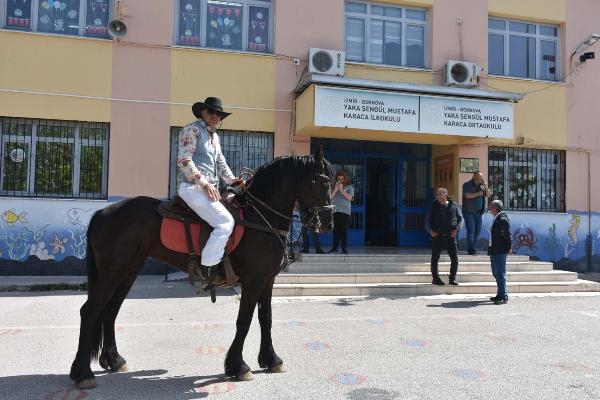 Bornova'da oturan at eğitmeni Faruk Ceren, oy kullanmak için sabah erken saatlerde sandık başına gitti. Ceren, oy kullanacağı Bornova Yaka Şengül Mustafa Karaca İlkokulu'na at üstünde kovboy kıyafeti ile geldi. Okul bahçesindeki bir ağaca atını bağlayan Ceren, oyunu kullandı. Oy kullanma işlemi için okula gelen bazı ailelerin çocukları ise ata bindi. Faruk Ceren, "Demokrasinin gereğini yerine getirip, oy kullanmak için bugün sandığa atımla geldim. Gergin bir dönemden geçiyoruz. Bu gerginliği üzerimden atmak için araç yerine atımı tercih ettim. Hem keyifli bir yolculuk oldu hem de vatandaşlardan olumlu tepkiler aldım. Evime tekrar atımla döneceğim" dedi. (DHA)