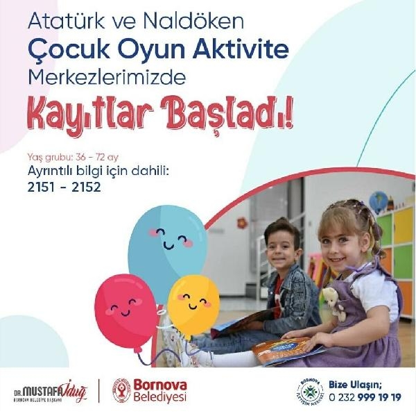 BORNOVA Belediyesi, ihtiyaç sahibi ailelerin çocukları için hayata geçirdiği ücretsiz çocuk oyun ve aktivite merkezlerinin sayısını 8'e çıkardı. Atatürk ve Naldöken Mahallelerinde 36 - 72 ay arasındaki çocukların yararlanabildiği 2 merkezde kayıtlar başladı.