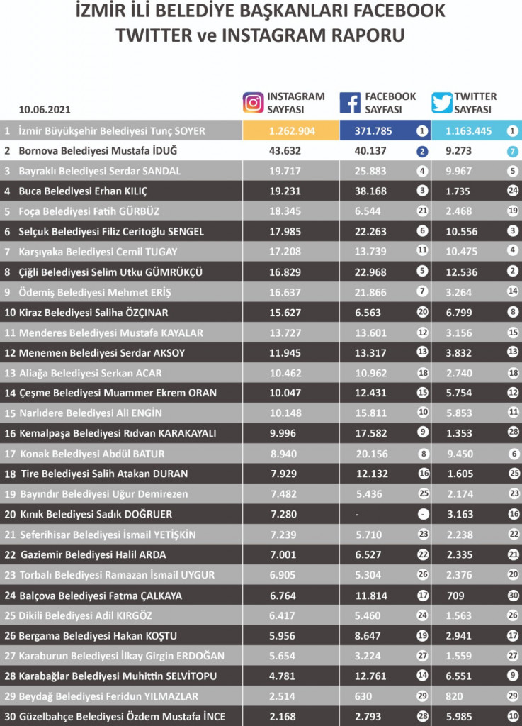 İduğ, tüm sosyal medya hesapları ile 2021 yılının en aktif belediye başkanı olarak dikkat çekerken, Bornova Belediyesi sosyal medya hesapları ile İzmir’in en yüksek takipçiye sahip ilçe belediyesi oldu. Facebook’ta Türkiye genelinde Kadıköy’den sonra yine ilçe belediyeleri arasında ikinci sırada yer alan Bornova Belediyesi, diğer platformlarda da yine ilk sıralarda bulunuyor.