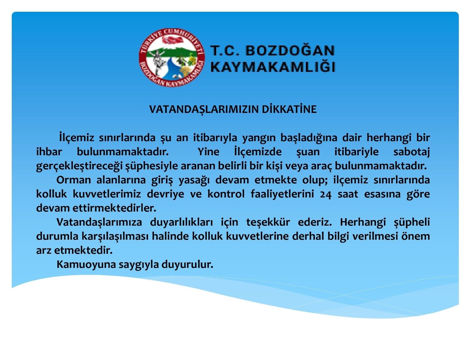 Son günlerde yaşanan yangınlarda sabotaj ihtimalleri göz önünde bulundurulurken konu ile ilgili Bozdoğan Kaymakamlığı önemli bir duyuruda bulundu. İlçe genelinde olası bir yangının yaşanması adına sabotaj ihtimali bulunan şüpheli şahıs veya araç bulunmadığını açıkladı. Ormanlık alanlara giriş çıkışların yasaklanması dolayısıyla ilçe genelinde 24 saat kontrollerin devam ettiğinin altına çizen Bozdoğan Kaymakamlığı, yaptığı açıklamada "Vatandaşlarımızın dikkatine. İlçemiz sınırları şu an itibariyle yangın başladığına dair herhangi bir ihbar bulunmamaktadır. Yine ilçemizde şuan itibariyle sabotaj gerçekleştireceği şüphesiyle aranan belirli bir kişi veya araç bulunmamaktadır. Orman alanlarına giriş yasağı devam etmekte olup, ilçemiz sınırlarında kolluk kuvvetlerimiz devriye ve kontrol faaliyetlerini 24 saat esasına göre devam ettirmektedirler. Vatandaşlarımıza duyarlılıkları için teşekkür ederiz. Herhangi şüpheli durumla karşılaşılması halinde kolluk kuvvetlerine derhal bilgi verilmesi önem arz etmektedir" ifadelerine yer verildi.