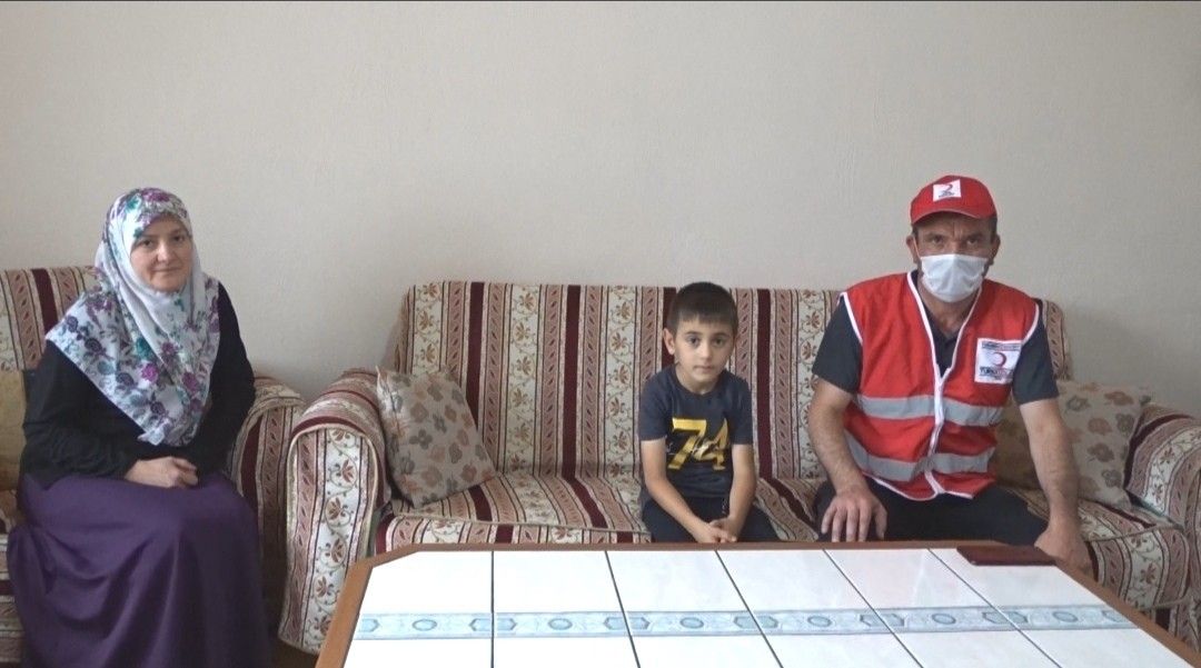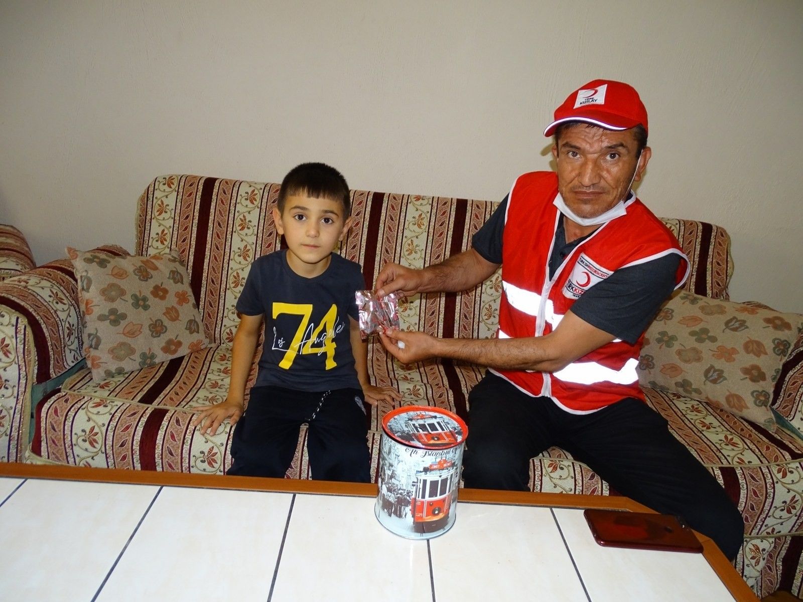 Kızılay Temsilcisi Mustafa Şen, örnek davranışından dolayı minik Melih'e kol saati hediye etti.
