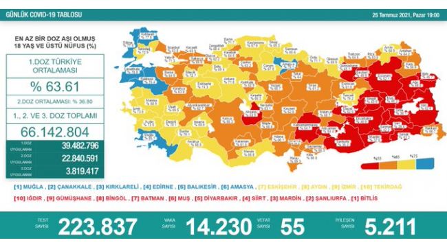 Sağlık Bakanlığı tarafından Türkiye'nin yeni korona virüs tablosu açıklandı. 25 Temmuz'da açıklanan 24 saatlik verilere göre 14 bin 230 vaka tespit edildi. Virüs nedeniyle hayatını kaybedenlerin sayısı 55 oldu. Bir günde toplam 223 bin 837 test yapılırken, iyileşen hasta sayısı 5 bin 211 olarak kaydedildi. Sağlık Bakanlığı tarafından açıklanan tabloda, aşılama verilerine de yer verildi. En az 1 doz aşı olmuş 18 yaş üzeri nüfusu kapsayan verilere göre Türkiye'de 1. doz aşılama ortalama yüzde 63,61 oldu. 2. doz ortalaması yüzde 36,80 olurken, 1., 2. ve 3. doz aşısını olan vatandaş sayısı toplamda 66 milyon 142 bin 804'e yükseldi.