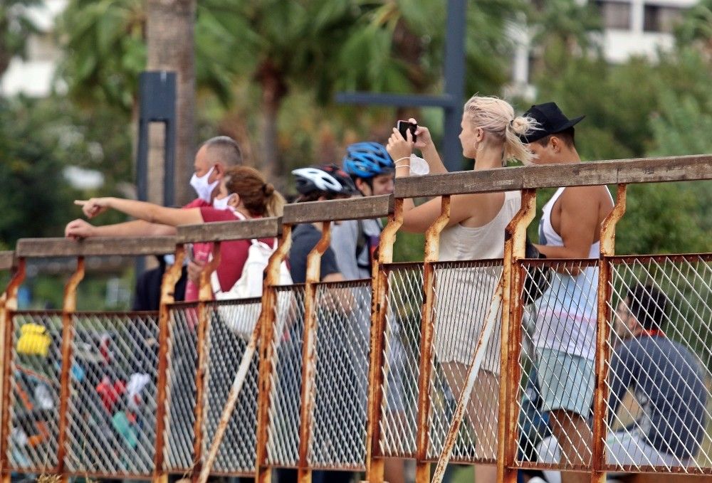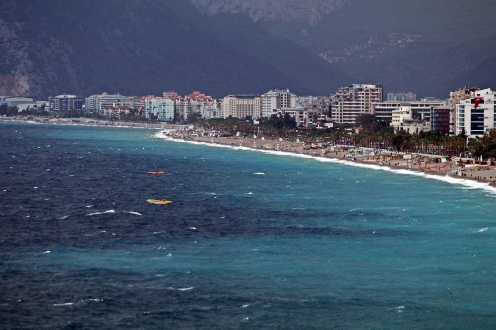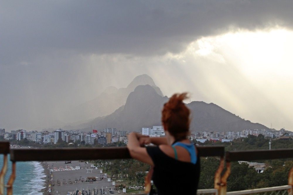 Antalya'da bugün etkili olan rüzgarlı hava, dünyaca ünlü sahilde kent sakinleri ve tatilcilere eşsiz bir manzara sundu. Rüzgarla birlikte dalgaların dövdüğü sahil beyaza büründü, denizin rengiyse mavi ve turkuaza büründü. Sahilin batı kısmındaki Bey Dağları'nı kaplayan yağmur bulutları arasından süzülen ışık hüzmesiyle birlikte sahilde görsel şölen oluştu. Seyir terasındaki muhteşem manzarayı görenler cep telefonlarına sarılıp bol bol fotoğraf çekindi.