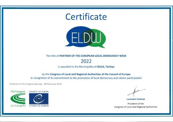 İZMİR'in Buca Belediyesi, Avrupa Konseyi tarafından koordine edilen Avrupa Yerel Demokrasi Haftası (European Local Democracy Week - ELDW) kapsamında üst üste 3. kez 'Yılın Partner Kenti' unvanını almaya hak kazandı.