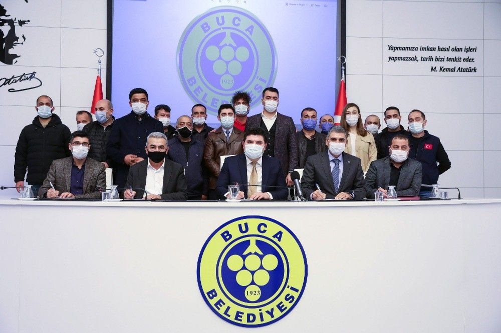 İmza törenine Buca Belediye Başkanı Av.Erhan Kılıç, DİSK Genel İş Genel Başkanı Remzi Çalışkan, DİSK Genel İş Genel Sekreteri Şükret Sevgener, DİSK Genel İş Toplu İş Sözleşme Daire Başkanı Çetin Çalışkan, DİSK Genel İş Eğitim Daire Başkanı Mehmet Salih Doğrul, CHP Buca İlçe Başkanı Hacer Taş Gültepe, DİSK Ege Bölge Temsilcisi Memiş Sarı, DİSK Genel İş 5'nolu Şube Başkanı Ali Haydar Kara, Buca Belediyesi Başkan Yardımcıları, sendika temsilcileri ve işçiler katıldı.