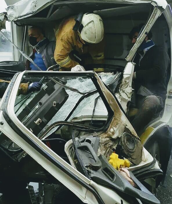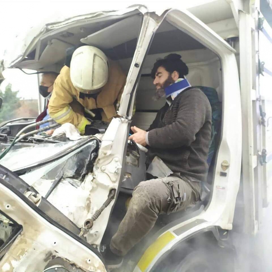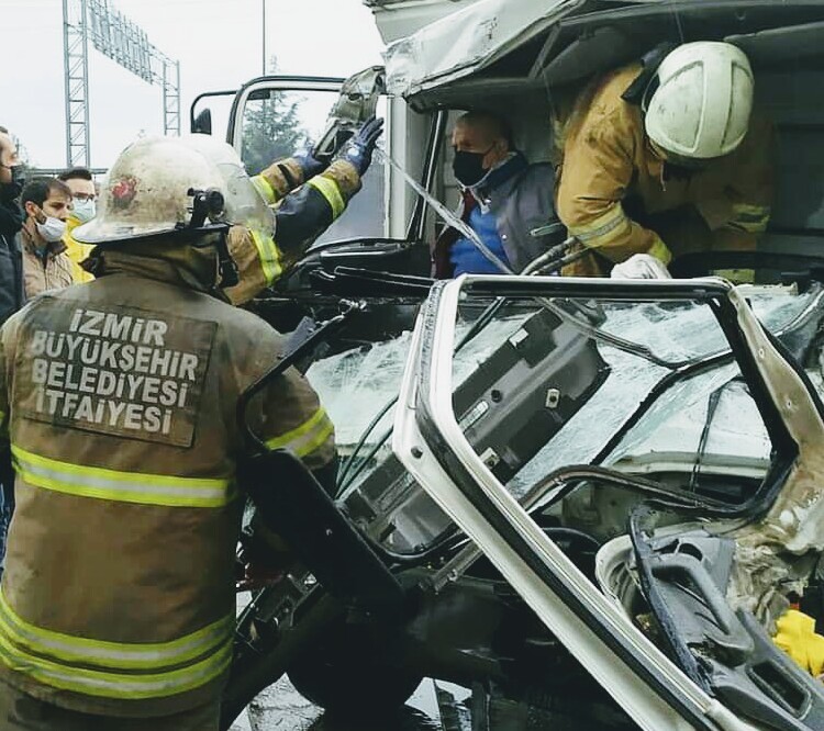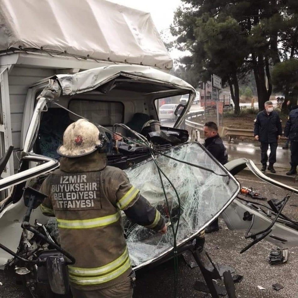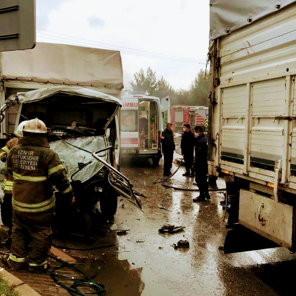 Kaza bugün saat 09.00'da 29 Ekim Mahallesi sebze hali kavşağında meydana geldi. Kamyonet kavşakta, başta bir kamyonla çarpıştı. Trafik kazasını gören vatandaşlar durumu yetkililere bildirdi. İhbarı üzerine İzmir İtfaiyesi Merkez Bölge Amirliğine bağlı Merkez Yenişehir ve Evka1 itfaiye gruplarından 2. posta AKS 110 ekipleri, yangın müdahale ekipleri ile 112 acil sağlık ekipleri olay yerine sevk edildi.