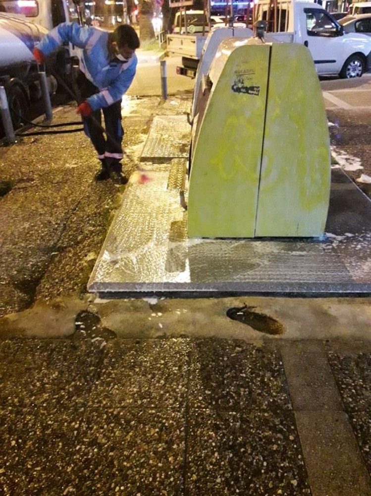 Temiz bir kent için saha emekçileriyle çalışmalarını sürdüren Buca Belediyesi, gece çöp konteynerlerine dezenfekte operasyonu başlattı. Koronavirüs (Covid-19) tehdidi başta olmak üzere çöp konteynerlerinin enfeksiyon yayma riskini ortadan kaldırmak için Buca Belediyesi Temizlik İşleri Müdürlüğü ekipleri, sokağa çıkma yasağı saatlerinde trafiği aksatmamak adına ilçe genelindeki çöp konteynerlerini temizledi. Teker teker fırçalarla sabunlanan konteynerler daha sonra baştan aşağı yıkanarak dezenfekte edildi. Ekiplerin, vatandaşın sağlığı için çalışmalarını ana arterlerden başlayarak 47 mahallede sürdürmeye devam edeceği belirtildi.