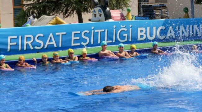 İZMİR'in Buca Belediyesi Başkanı Erhan Kılıç'ın Yıldız ve Mustafa Kemal mahallelerinde çocuklara yaz tatili hediyesi olarak hayata geçirdiği portatif havuzlar ilgi gördü. 6 haftada toplam 7 bin 500 çocuğun yüzme öğreneceği kurslara katılan minikler, proje için teşekkür etti.