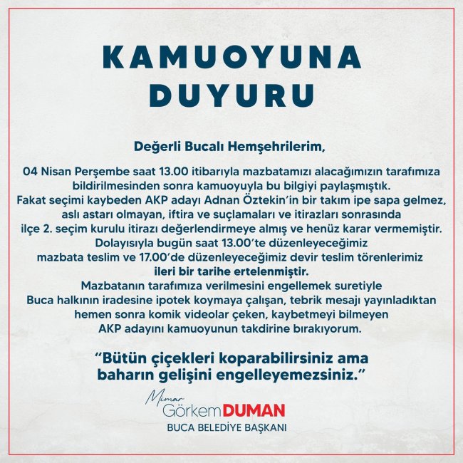 31 Mart Yerel Seçimleri'nde CHP Buca Adayı Görkem Duman oyların yüzde 41,85’ini alarak belediye başkanı olmuştu. Bugün saat 13.00’da mazbatasını almayı bekleyen Duman, yaptığı açıklamayla AK Parti Adayı Adnan Öztekin’in itirazları nedeniyle mazbata ve devir teslim törenlerinin ertelendiğini duyurdu.