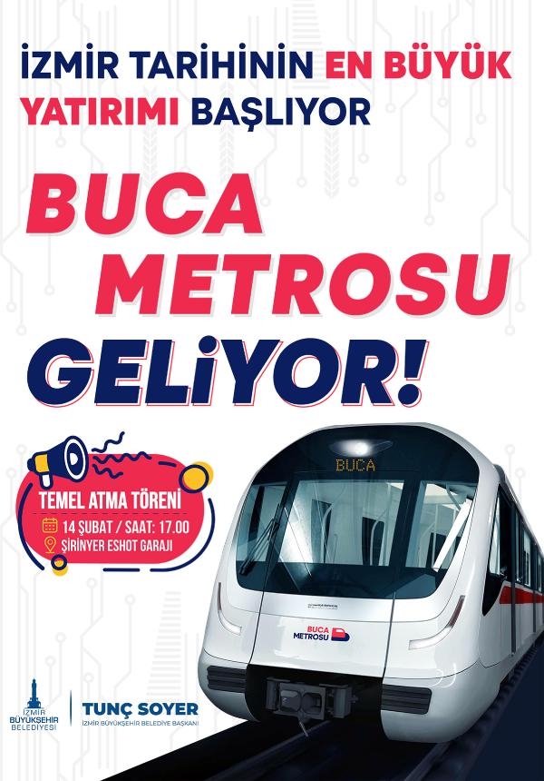Buca Metrosu'nun temeli 14 Şubat'ta CHP Genel Başkanı Kemal Kılıçdaroğlu'nun katılacağı törenle atılacak. Kent trafiğine nefes aldıracak 13,5 kilometrelik metro hattının yapımına başlayacak olmanın gururunu yaşadıklarını belirten İzmir Büyükşehir Belediye Başkanı Tunç Soyer, "Türkiye'nin bu kaotik ortamında İzmir'in geleceğini aydınlatacak Avrupa'nın en büyük yatırımlarından birinin temelini genel başkanımızın katılımıyla atacağız. Söz verdiğimiz gibi İzmir'i demir ağlarla örüyoruz. Bu tarihi güne tanıklık etmek için tüm hemşehrilerimi Buca'ya temel atma törenine davet ediyorum. Bu gurur tüm İzmir'in" ifadelerini kullandı.