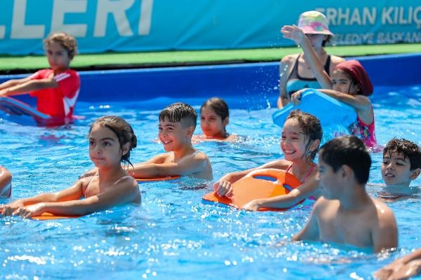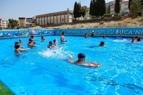 İZMİR'in Buca ilçesinde, belediye tarafından kurulan iki büyük portatif havuzda 6 haftada, ailesinin maddi durumu iyi olmayan toplam 7 bin 500 çocuğa yüzme eğitimi verileceği bildirildi.