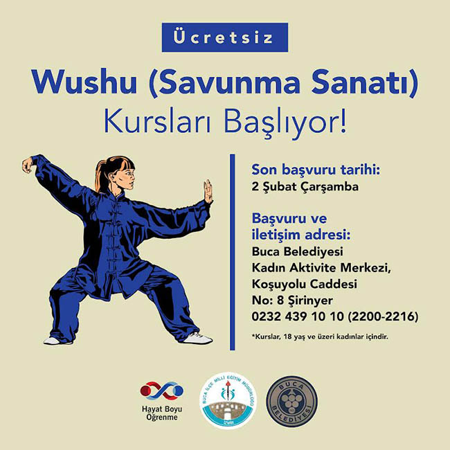 Toplumsal cinsiyet eşitsizliğine karşı kadının her alanda güçlendirilmesi için projeler geliştirmeyi görev bilen Buca Belediyesi, Çin'in binlerci yıllık önemli bir savunma sanatı olan "wushu"yu kadınlarla buluşturacak. Kadın Aktivite Merkezi’nde 18 yaş ve üzeri Bucalı kadınlar için düzenlenecek kurslara 2 Şubat Çarşamba gününe kadar başvuru yapılabilecek.