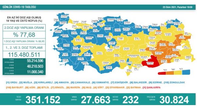 Sağlık Bakanlığı tarafından Türkiye'nin yeni korona virüs tablosu açıklandı. 25 Ekim'de açıklanan 24 saatlik verilere göre 27 bin 663 vaka tespit edildi. Virüs nedeniyle hayatını kaybedenlerin sayısı 232 oldu. Bir günde toplam 351 bin 152 test yapılırken, iyileşen hasta sayısı 30 bin 824 olarak kaydedildi.