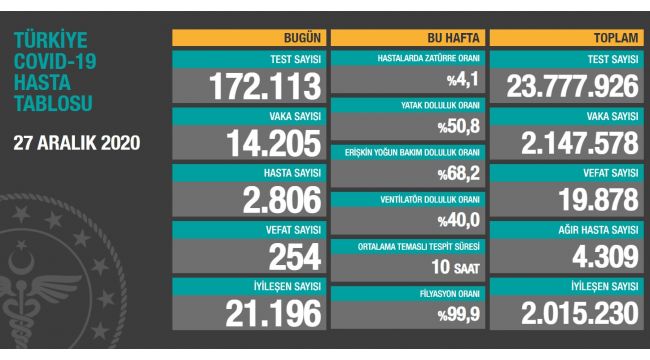Sağlık Bakanlığının Covid-19 bilgilendirme sayfasında Türkiye'nin güncel korona virüs tablosu kamuoyuyla paylaşıldı. Tabloya göre son 24 saatte 254 kişi korona virüsten hayatını kaybetti, toplam can kaybı 19 bin 878'e yükseldi. Toplamda 23 milyon 777 bin 926 test yapıldı. Bugün yapılan 172 bin 113 testten, 14 bin 205 yeni vaka sayısı, 2 bin 806 kişinin de hastaneye yatan vaka olduğu belirtildi. Toplam vaka sayısının 2 milyon 147 bin 578 olduğu, bugün iyileşen 21 bin 196 kişiyle birlikte toplam iyileşen hasta sayısının 2 milyon 15 bin 230'e yükseldiği, toplam hastalarda zatürre oranının yüzde 4,1, ağır hasta sayısının ise 4 bin 309 olduğu açıklandı.