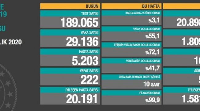 Sağlık Bakanlığı, son 24 saatte 222 kişinin korona virüsten hayatını kaybettiğini, 29 bin 136 yeni vaka sayısının olduğu açıkladı.