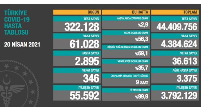 Sağlık Bakanlığının Covid-19 bilgilendirme sayfasında Türkiye'nin güncel korona virüs tablosu kamuoyuyla paylaşıldı. Tabloya göre son 24 saatte 346 kişi korona virüsten hayatını kaybetti, toplam can kaybı 36 bin 613'a yükseldi. Toplamda 44 milyon 409 bin 756 test yapıldı. Bugün yapılan 322 bin 128 testten, 61 bin 28 yeni vaka sayısı, 2 bin 895 kişi de yeni hasta sayısı olduğu belirtildi. Toplam vaka sayısının 4 milyon 384 bin 624 olduğu, bugün iyileşen 55 bin 592 kişiyle birlikte toplam iyileşen hasta sayısının 3 milyon 792 bin 129'a yükseldiği, toplam hastalarda zatürre oranının yüzde 2,9, ağır hasta sayısının ise 3 bin 375 olduğu açıklandı.