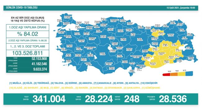 Sağlık Bakanlığı tarafından Türkiye'nin yeni korona virüs tablosu açıklandı. 15 Eylül'de açıklanan 24 saatlik verilere göre 28 bin 224 vaka tespit edildi. Virüs nedeniyle hayatını kaybedenlerin sayısı 248 oldu. Bir günde toplam 341 bin 004 test yapılırken, iyileşen hasta sayısı 28 bin 536 olarak kaydedildi. Sağlık Bakanlığı tarafından açıklanan tabloda, aşılama verilerine de yer verildi. En az 1 doz aşı olmuş 18 yaş üzeri nüfusu kapsayan verilere göre Türkiye'de 1. doz aşılama ortalama yüzde 84,02 oldu. 2. doz ortalaması yüzde 66,35 olurken, 1., 2. ve 3. doz aşısını olan vatandaş sayısı toplamda 103 milyon 526 bin 811'e yükseldi.