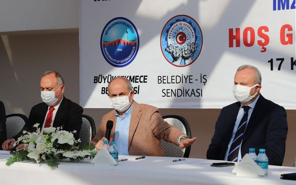 Belediye - İş Sendikası İstanbul 1 Nolu Şube Başkanı Sezai Akyürek, toplu iş sözleşmesinin Büyükçekmece Belediyesi ve Belediye - İş Sendikası için hayırlı olması temennisinde bulunarak şöyle konuştu; "Başta sayın belediye başkanımız olmak üzere sözleşme heyetimize katkılarından ve emeklerinden dolayı teşekkür ediyorum. Yılların birikmiş yasal mağduriyetini bu toplu iş sözleşmesiyle bir nebze de olsa tedavi etmenin sevincini yaşıyoruz. Değerli arkadaşlar bugün mutlu günümüz. Nihayet gerçek işverenimizle toplu iş sözleşmesi yapıyoruz. İlk sözleşme olmasından kaynaklı yılların birikmiş ücret dengesizliğini bir anda çözümlemek mümkün değil ama sayın başkanımız bu sorunu bildiğinden elinden gelen bütün imkanları zorladı. Kendilerine teşekkür ediyorum. İnşallah önümüzdeki sözleşmelerde bu ücret dengesizliği adım adım ortadan kalkacaktır."
