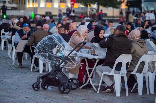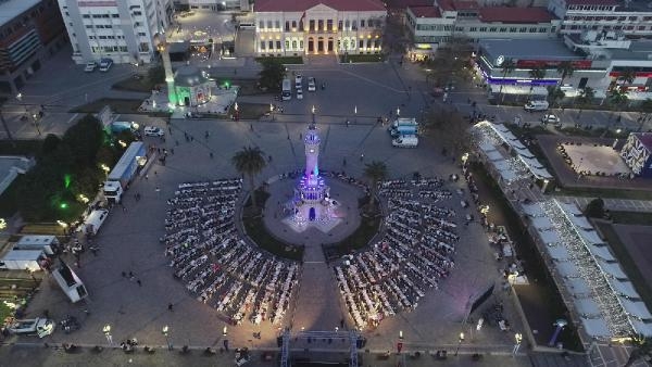 İzmir Büyükşehir Belediyesi'nin ramazan ayının ilk gününde Konak'taki Atatürk Meydanı'nda düzenlediği iftar yemeği, 3 bin vatandaşı buluşturdu. Yemek öncesinde ve sonrasında semazen gösterisi yapıldı, Kur'an-ı Kerim okundu. İlk iftar yemeği öncesinde İzmirlilere seslenen İzmir Büyükşehir Belediyesi Genel Sekreter Yardımcısı Ertuğrul Tugay, "Ramazan ayının hepinize hayırlı olmasını diliyorum. Ramazanımız mübarek olsun. Geçen yıl ne yazık ki ağır pandemi koşulları nedeniyle iftar sofralarında buluşamadık. Bu sene şartların biraz daha iyileşmesi itibariyle tekrar bir aradayız. Dayanışma, paylaşma bu toprakların kadim kültüründe var. Bu zor günlerde hep birlikte paylaşarak omuz omuza vereceğiz. Mübarek ramazan ayında bu yıl yine dayanışmanın en güzel örneklerine imza atılacak" dedi. Vatandaşlar ise pandemi sonrasında kurulan büyük iftar sofralarından duydukları memnuniyeti dile getirdi.