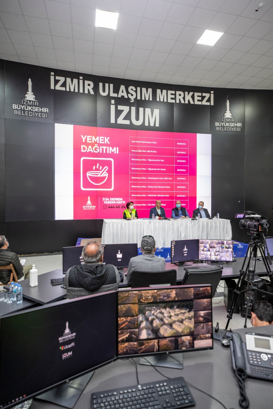 İzmir Büyükşehir Belediye Başkanı Tunç Soyer, İzmir Ulaşım Merkezi’nde (İZUM) oluşturulan kriz merkezinde basın toplantısı düzenledi. 6.9 büyüklüğündeki Ege depreminin üzerinden geçen 50 saat içerinde yapılan çalışmalar hakkında bilgi veren Başkan Soyer, arama kurtarma çalışmalarına katılan tüm ekiplere teşekkür ederek sözlerine başladı. Başkan Soyer, deprem anında Kiraz’ın Avunduruk köyünde olduğunu ve programını yarıda keserek İzmir’e döndüğünü dile getirerek “Yolda bilgi almaya başladık. Arkadaşlarımızdan HİM üzerinden gelen ihbarlar ve tespitler çerçevesinde 20’ye yakın binada ağır hasar olduğu bilgisini aldık. Narlıdere Metrosu, çalışan faal metro hatları, İZBAN ve tramvay hatları, İZSU’nun altyapı kanallarıyla ilgili bilgi aldık. Çok şükür ki altyapımızla ilgili sıkıntı olmadı ğını gördük. Kısmi bazı noktalarda elektrik kesintileri olduğunu, doğalgazın güvenlik nedeniyle kesildiği bilgisini aldık” dedi.