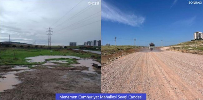 Eş zamanlı yürütülen bir diğer yol çalışması ise Menemen’de. İstiklal Mahallesi 5. Cadde ile 7440 Sokak arasında 25 metre genişliğinde 350 metre uzunluğunda ulaşım yolu açılıyor. Sevgi Caddesi'ndeki 20 metre genişliğinde 700 metre uzunluğundaki yol çalışmasının yüzde 85’i ise tamamlandı. Özellikle yeni yerleşim yerlerinin ağırlıkta olduğu noktada ulaşımı kolaylaştırmak için yapılan yollar Menemen halkına nefes aldıracak.