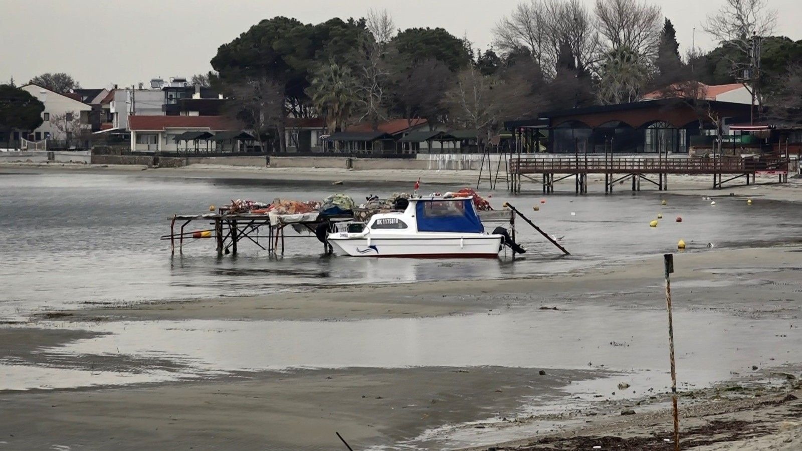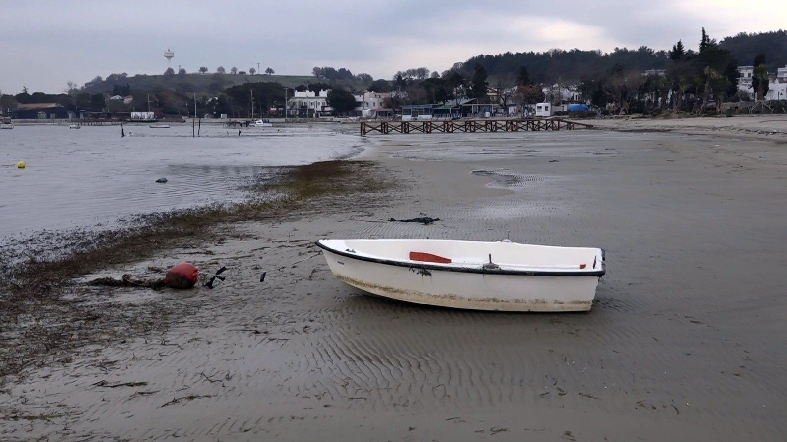 Çanakkale'de, meydana gelen gel-git olayı nedeniyle deniz suyu yaklaşık 30 metre çekildi. Kıyıda bulunan sandallar, karaya oturdu.