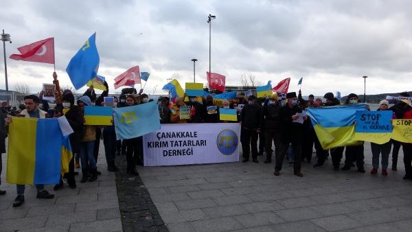 ÇANAKKALE'de toplanan Ukrayna, Kırım Tatarları ve Türk vatandaşları, Rusya'nın Ukrayna'ya saldırısını protesto etti.