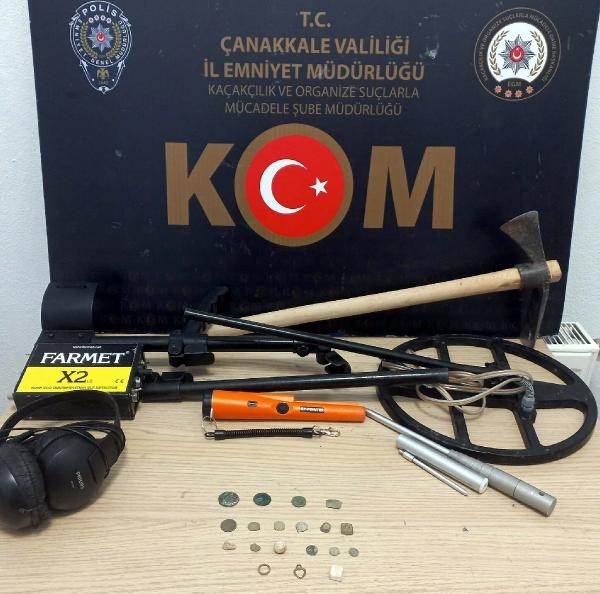 Çanakkale İl Emniyet Müdürlüğü Kaçakçılık ve Organize Suçlarla Mücadele Şubesi ekipleri, istihbarat çalışmasıyla M.E.'nin evinde tarihi eser bulunduğu bilgisine ulaştı. M.E.'nin evine, önceki gün operasyon düzenlendi. Operasyonda 11 sikke, 4 taş obje, 4 metal obje ile kazma, kulaklık, 2 dedektör ve 3 metal kazma aparatı ele geçirildi. M.E., gözaltına alındı. Şüphelinin polisteki işlemlerinin sürdüğü bildirildi. (DHA)