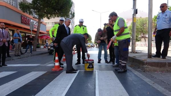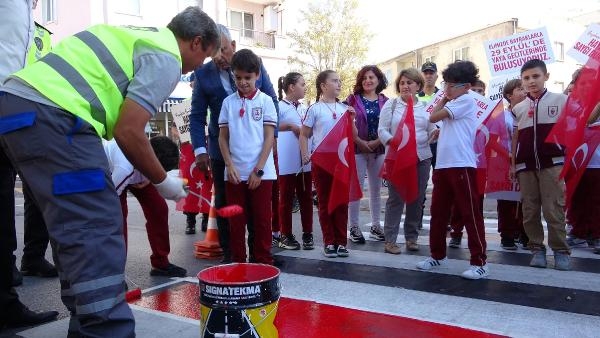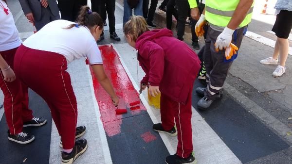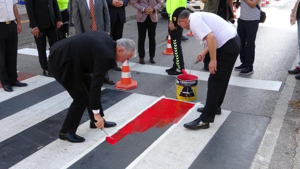ÇANAKKALE'de yaya önceliğine dikkat çekmek 'Yayalara öncelik duruşu, hayata saygı duruşu' sloganıyla düzenlenen etkinlik kapsamında Çanakkale Valisi İlhami Aktaş ve öğrenciler tarafından yaya geçidinin bir şeridi kırmızıya boyandı.