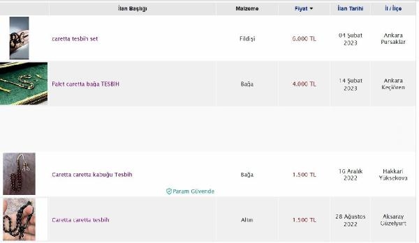Tespihleri satanların, ilanların 'açıklama' kısımlarına ise "Palet caretta. Muazzam kondisyon, muazzam temizlikte. 925 ayar gümüş üstü altın kaplama püskül. 1 adet yedek habbe ve sistem parçaları", "Alman caretta tesbih. AVM'den alındı. 2 bin 500 lira civarı, 1500 liraya bırakıyorum", "Orjinaldir" yazdıkları görüldü.