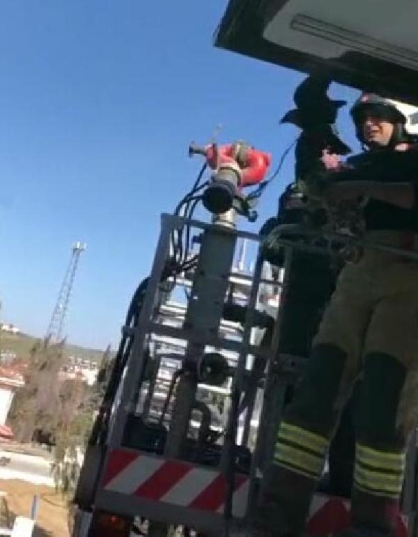 Çatıya sıkışan kargayı kurtaran ekibe çiçekle teşekkür etti