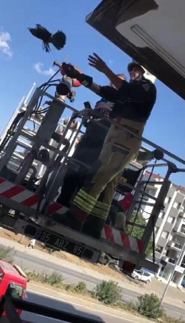 İZMİR'in Seferihisar ilçesinde, üç katlı bir apartmanın çatısına sıkışan karga, Elçin Duru'nun (39), 112 Acil Çağrı Merkezi'ne yaptığı ihbar üzerine kurtarıldı. Yaptığı ihbar karşısında hassasiyet gösteren 112 Acil Çağrı Merkezi'ni ziyaret edip, çiçek vererek teşekkür eden Duru, "Olaya bu kadar hızlı müdahale edebilecekleri aklıma gelmezdi. Cana verdikleri duyarlılık takdire şayan" dedi.