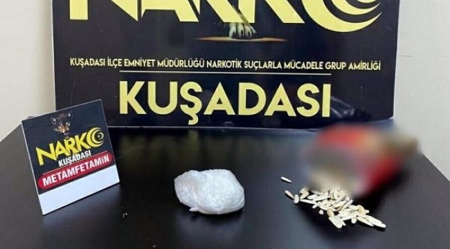 İlçe Emniyet Müdürlüğü Narkotik Suçlarla Mücadele Büro Amirliği ekipleri, Kuşadası Otogarı'nda şüphe üzerine 2 kişiyi durdurdu. Şüphelilerin kimlik sorgulamalarından S.K. ve M.A. olduğu belirlendi. Şüphelilerin üzerleri ve çantalarında arama yapıldı. Aramada S.K.'nin elindeki çekirdek paketinde 99,54 gram metamfetamin ele geçirildi. Şüpheliler S.K. ve M.A., gözaltına alındı. Emniyetteki işlemlerin ardından adliyeye sevk edilen şüpheliler, tutuklandı. (DHA)