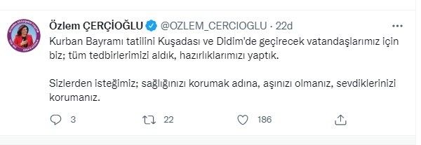 Tüm tedbirleri aldıklarını ve hazırlıklarını tamamladıklarını kaydeden paylaşımında şu ifadelere yer verdi: "Kurban Bayramı tatilini Kuşadası ve Didim'de geçirecek vatandaşlarımız için biz; tüm tedbirlerimizi aldık, hazırlıklarımızı yaptık. Sizlerden isteğimiz; sağlığınızı korumak adına, aşınızı olmanız, sevdiklerinizi korumanız."