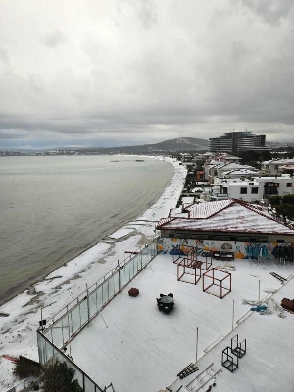 İZMİR'in Çeşme ve karşıyaka ilçelerinde dolu etkili oldu. Sokak, cadde ve sahiller beyaz örtüyle kaplandı.