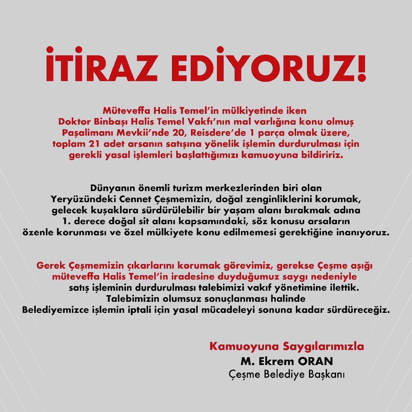 Çeşme Belediye Başkanı Ekrem Oran da bu tepkiye kayıtsız kalmayarak satışa karşı çıktığını sosyal medyadan duyurdu. Hatta 7 Mart’taki satış iptal edilmediği takdirde dava açacaklarını açıkladı. Başkan Oran, “Dünyanın önemli turizm merkezlerinden biri olan yeryüzündeki cennet Çeşme'mizin, doğal zenginliklerini korumak, gelecek kuşaklara sürdürülebilir bir yaşam alanı bırakmak adına 1. derece doğal sit alanı kapsamındaki, söz konusu arsaların özenle korunması ve özel mülkiyete konu edilmemesi gerektiğine inanıyoruz” diyerek şu paylaşımı yaptı.