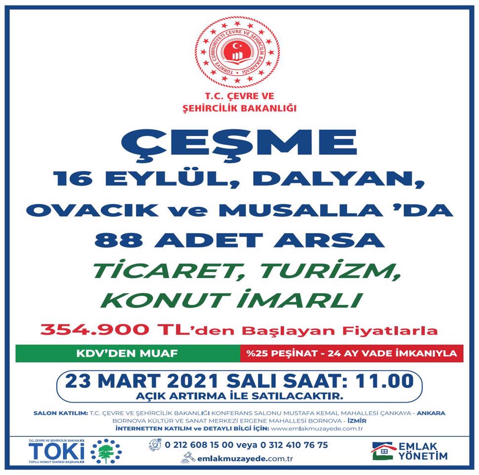 Çevre ve Şehircilik Bakanlığı, İzmir'in Çeşme ilçesinde 88 arsa vasıflı taşınmazı açık artırma usulü ile satışa çıkardı.