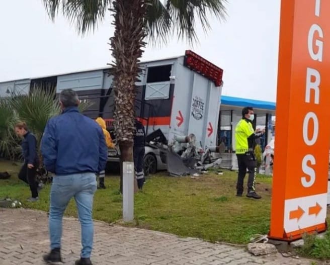 Feci olay bugün saat 14.30 sıralarında Çeşme Ilıca'da meydana geldi. Alaçatı’da inşaat işleri yapan müteahhit Mehmet Kün, sürat ve yağmur nedeniyle kullandığı aracın kontrolünü kaybederek yapım aşamasındaki akaryakıt istasyonuna daldı. Araç, burada tren vagonu olan kafeye çarparak durabildi.